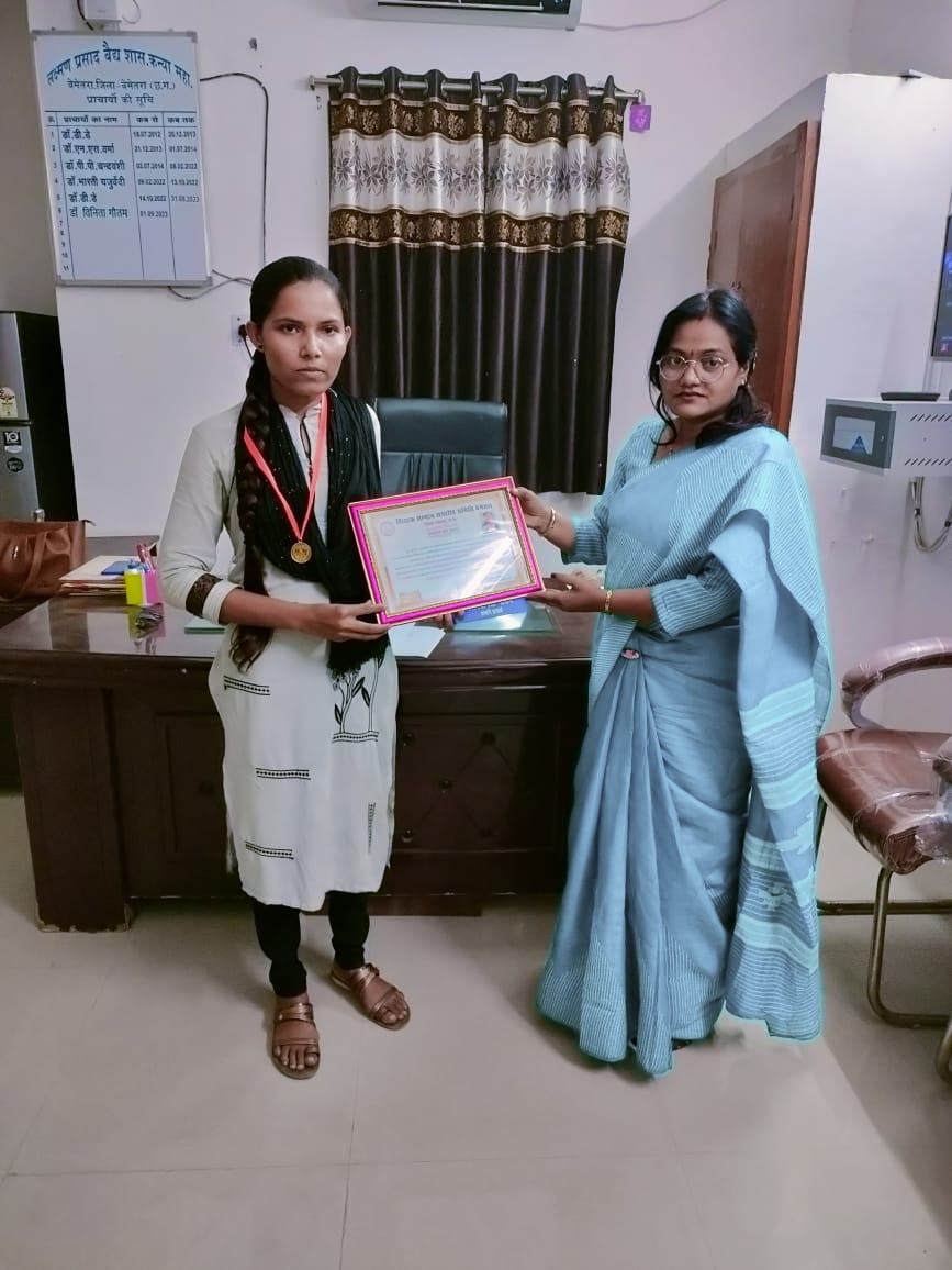 बेमेतरा जिला में स्थित लक्ष्मण प्रसाद बैद्य शासकीय कन्या महाविद्यालय बेमेतरा की छात्रा कुमारी चुनिया हेमचंद यादव विश्वविद्यालय द्वारा आयोजित विज्ञान स्नातक जीव विज्ञान परीक्षा 2023 में प्रविष्ट होकर बेमेतरा जिला में बालिका संवर्ग में सर्वोच्च स्थान प्राप्त की है, यह पुरस्कार शिक्षक सम्मान समारोह समिति बेमेतरा के मुख्य अतिथि रविंद्र चौबे मंत्री स्कूल शिक्षा विभाग छत्तीसगढ़ शासन कार्यक्रम की अध्यक्षता हेमचंद यादव विश्वविद्यालय की कुलपति माननीय डॉ अरुणा पल्टा एवं विशिष्ट अतिथि स्वामी प्रपत्यानंद संपादक विवेक ज्योति, रामकृष्ण मिशन विवेकानंद आश्रम रायपुर के करकमलों से उन्हें हरि शर्मा द्वारा अपने पति स्वर्गीय राधेश्याम शर्मा जी की स्मृति में स्वर्ण पदक से सम्मानित किया गया। शिक्षक सम्मान समारोह के इस शुभ अवसर पर लक्ष्मण प्रसाद बैद्य कन्या महाविद्यालय बेमेतरा की प्रभारी प्राचार्य डॉ विनिता गौतम जी ने कु . चुनिया को पुष्प गुच्छ भेंट कर उनको आशीर्वाद एवं उनके उज्जवल भविष्य के लिए शुभकामनाएं दी। साथ ही साथ प्रभारी प्राचार्या डॉ गौतम ने यह भी कहा की यह सम्मान केवल कन्या महाविद्यालय ही नहीं अपितु पूरे बेमेतरा जिले के लिए गर्व की बात है।