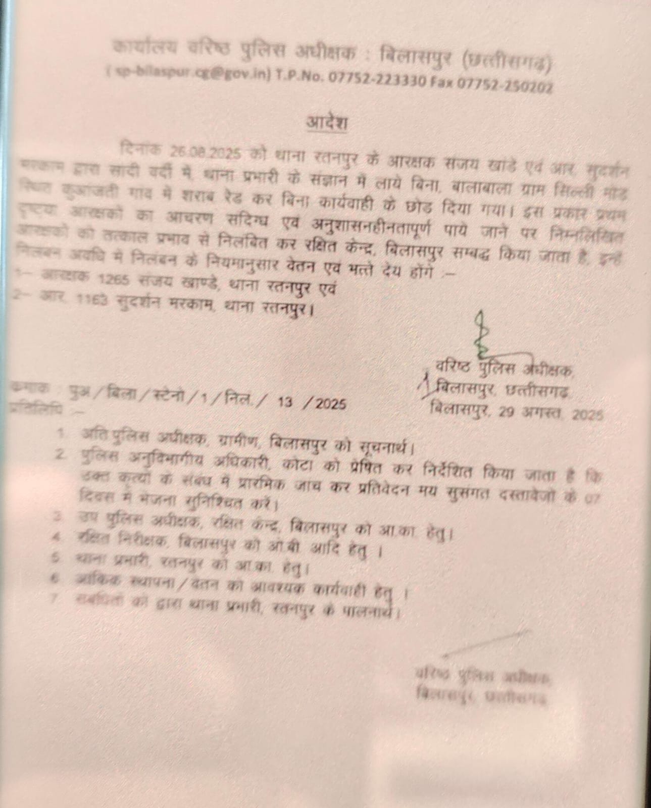 **बिलासपुर। 26 अगस्त 2025** – बिलासपुर पुलिस विभाग ने अनुशासनहीनता और संदिग्ध आचरण के मामले में रतनपुर थाना के दो आरक्षकों को निलंबित कर रक्षित केंद्र बिलासपुर संबद्ध कर दिया है। वरिष्ठ पुलिस अधीक्षक ने यह कार्रवाई तत्काल प्रभाव से की है।