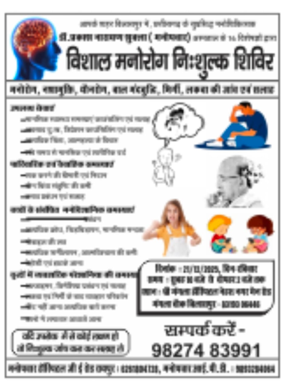 मानसिक स्वास्थ्य के प्रति बढ़ती चुनौतियों और आमजन में जागरूकता की आवश्यकता को ध्यान में रखते हुए बिलासपुर में एक **विशाल निःशुल्क मनो-रोग शिविर** का आयोजन किया जा रहा है। यह शिविर छत्तीसगढ़ के सुप्रसिद्ध मनोचिकित्सक **डॉ. प्रकाश नारायण शुक्ला** (मनोपचार) के मार्गदर्शन में आयोजित होगा, जिसमें उनके अस्पताल से जुड़े **16 अनुभवी विशेषज्ञ चिकित्सक** अपनी सेवाएं देंगे।