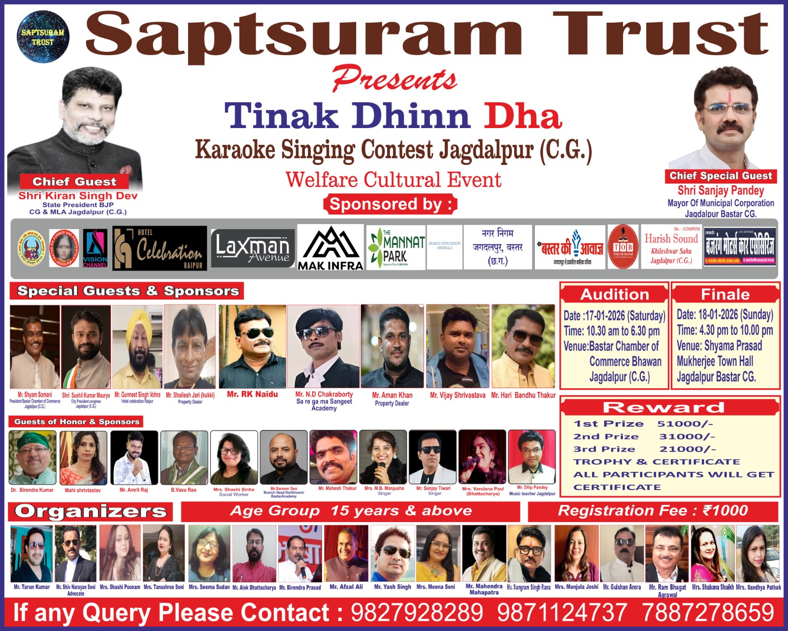 “जगदलपुर में गूंजेंगे सुरों के तराने — ‘तिनक धिन धा, कराओके सिंगिंग कॉन्टेस्ट’ के लिए ऑडिशन 17 जनवरी को ”