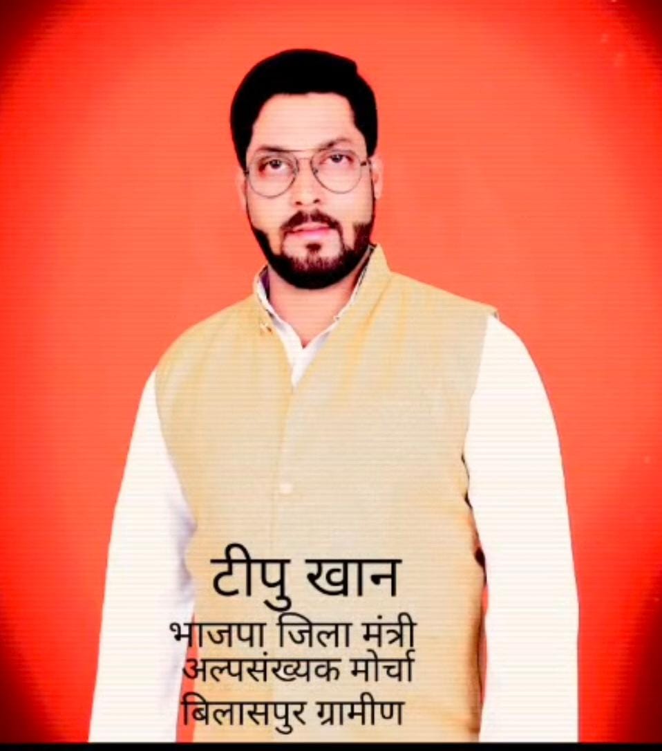 भारतीय जनता पार्टी अल्पसंख्यक मोर्चा में संगठन को मजबूत करते हुए टीपू खान को बिलासपुर ग्रामीण जिला मंत्री की जिम्मेदारी सौंपी गई है। यह नियुक्ति अल्पसंख्यक मोर्चा के प्रदेश अध्यक्ष **मखमूर इकबाल खान** की सहमति तथा भाजपा जिला अध्यक्ष **मोहित जयसवाल** की अनुशंसा पर की गई।