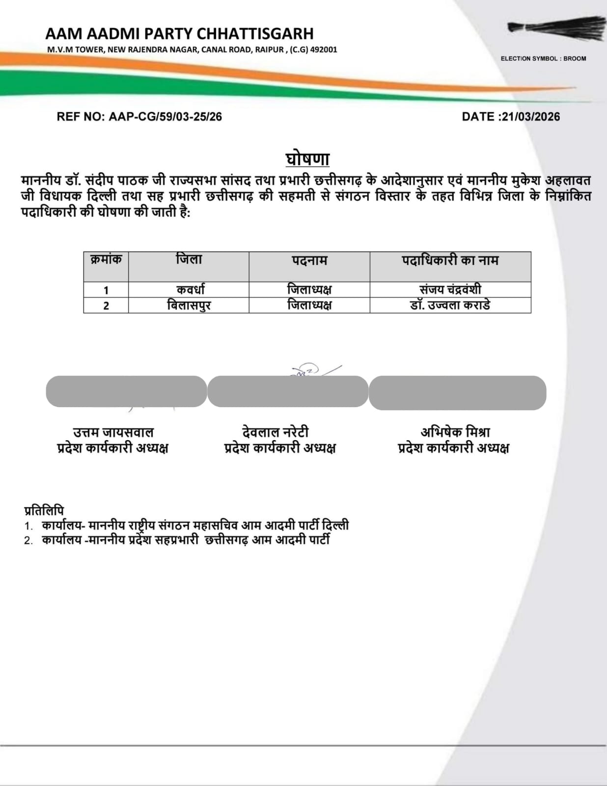 यह निर्णय डॉ. संदीप पाठक (राज्यसभा सांसद एवं छत्तीसगढ़ प्रभारी) के निर्देश पर तथा मुकेश अहलावत (विधायक, दिल्ली एवं सह-प्रभारी छत्तीसगढ़) की सहमति से लिया गया।
