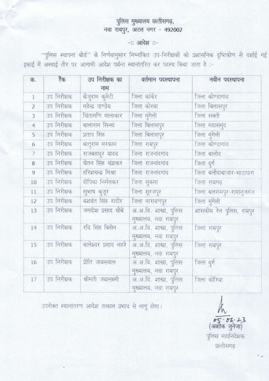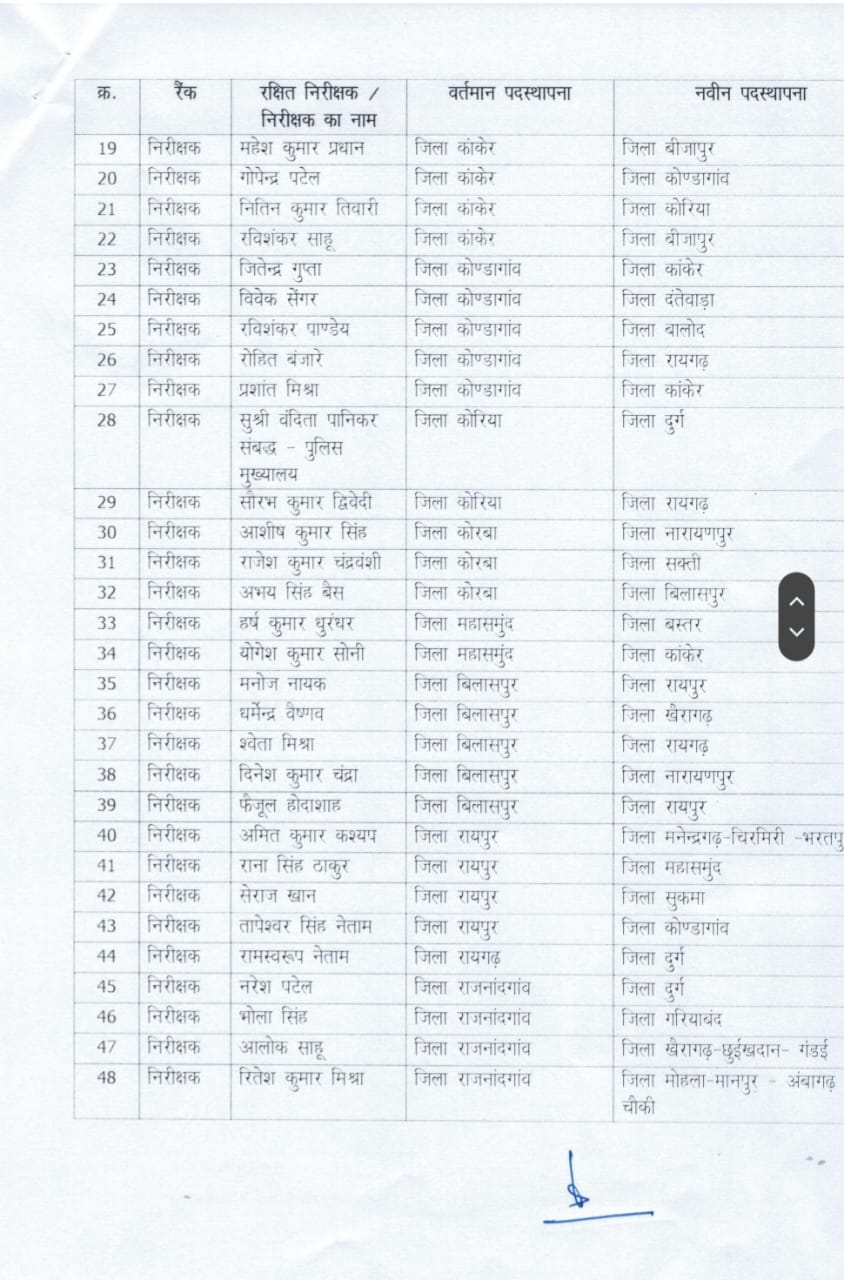 *ट्रांसफर ब्रेकिंग: रायपुर पुलिस मुख्यालय ने टीआई, एसआई का ट्रांसफर आदेश किया जारी…*