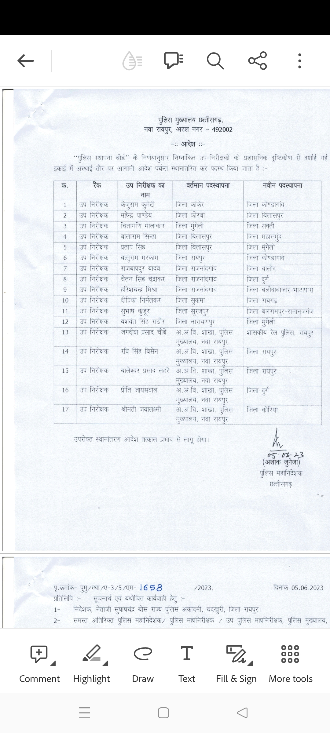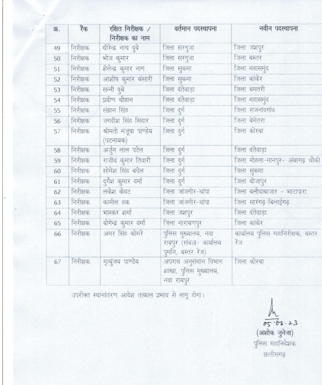 बिलासपुर 05 जून 2023।रायपुर पुलिस मुख्यालय ने तबादला आदेश जारी किया है।जिसमे 67 टीआई एवं 18 एसआई का तबादला आदेश जारी किया गया है।